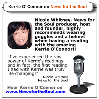 FRIDAY SEPT 26, 2008 - 6-7:30pm PST - OPEN LINES WITH KERRIE O'CONNOR! Life Changing On Air Readings With Kerrie O'Connor on News for the Soul - Kerrie can energetically view your personal life history and blueprints, observe your true inner processes and help attune and direct your soul’s purpose. Because of the powerful nature of these readings, show host Nicole Whitney 'recommends goggles and a helmet' :-). CALL IN TO EXPERIENCE IT FOR YOURSELF! website >